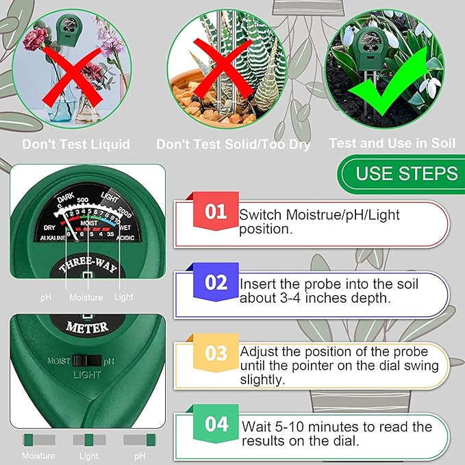 Take the confusion out of gardening with this smart 3-in-1 Soil Tester. Designed for home gardeners, plant lovers, and farmers, it instantly checks Moisture, pH Level, and Sunlight so you always know exactly what your plants need. No batteries, no hassle — just accurate readings within seconds!